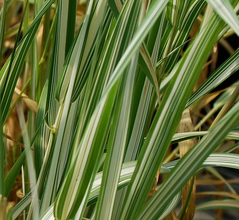Les feuilles de Phalaris arundinacea picta sont étroites, linéaires et vertes avec des rayures blanches.