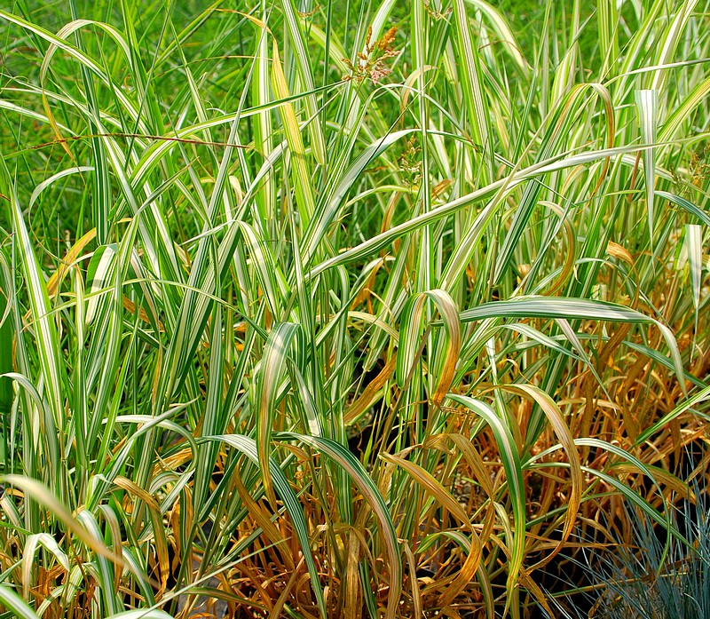 Les fleurs de Phalaris arundinacea picta sont regroupées sur des épillets vert pâle puis bruns.