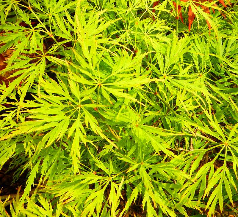 Les feuilles de 5 à 10cm de long de l'Acer palmatum Dissectum Kiri Nishiki sont opposées, palmées, très découpées, vertes et elles deviennent jaune orangé en automne.